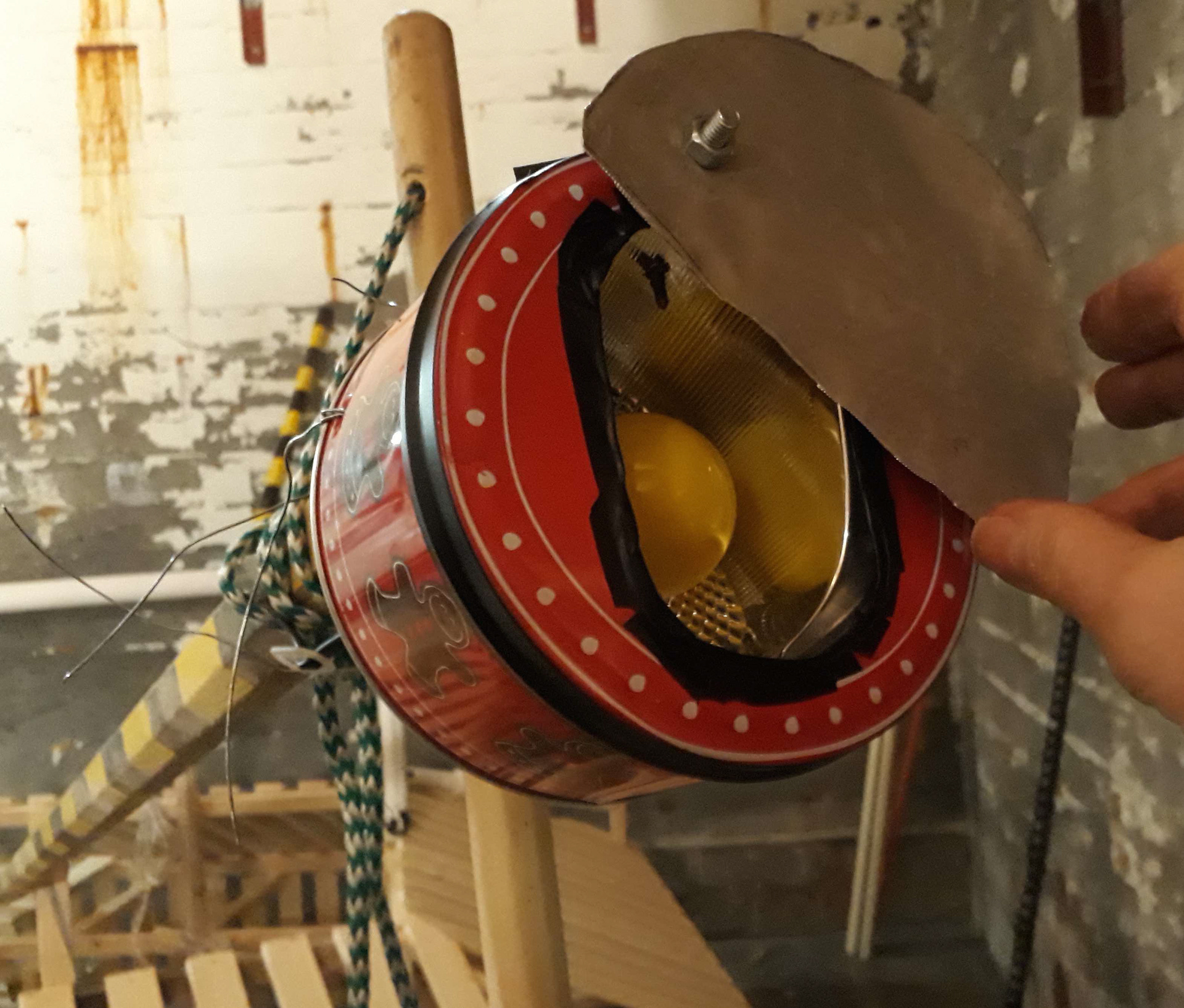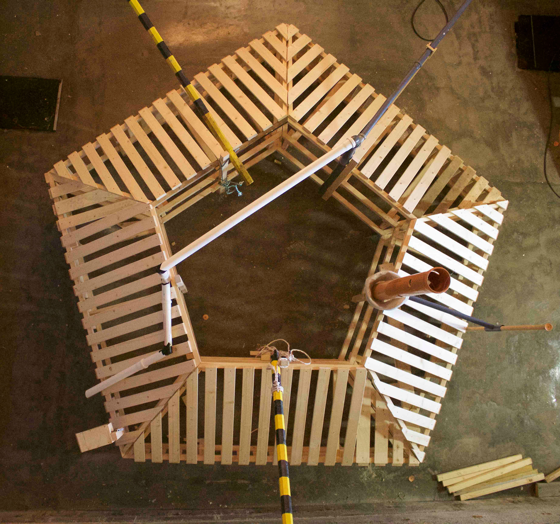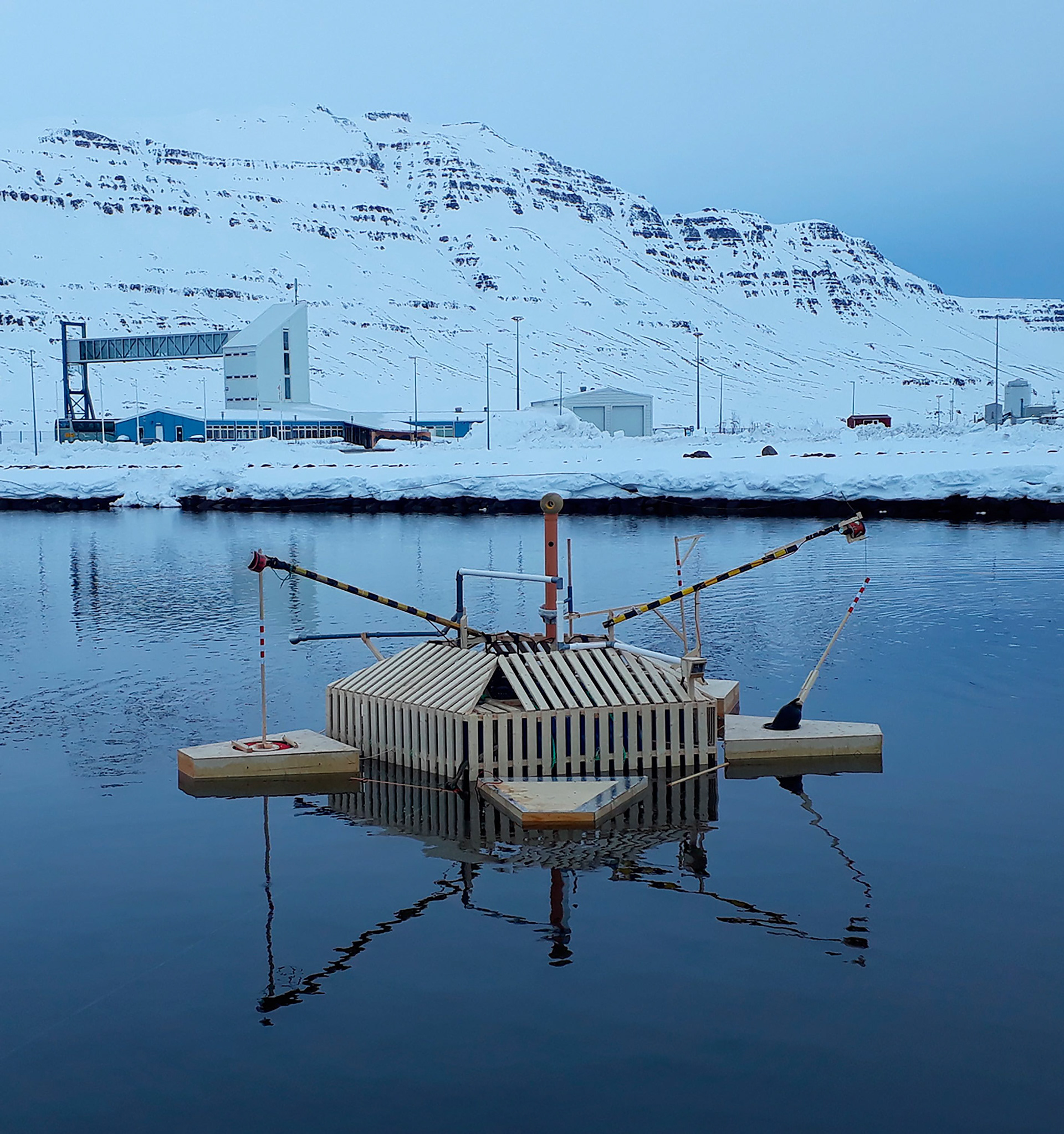 Skulpturen «Water Vessel Registrator 5» (2019) er bygget av funne gjenstander på Island. En pentagonal struktur har armer som kobler fri flytende elementer til seg, og enkle mekaniske deler gjør at lys blinker i takt med havets vugging.